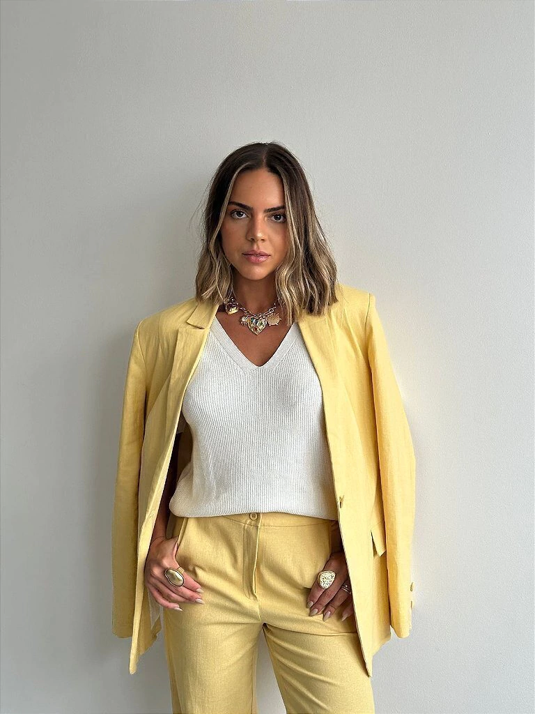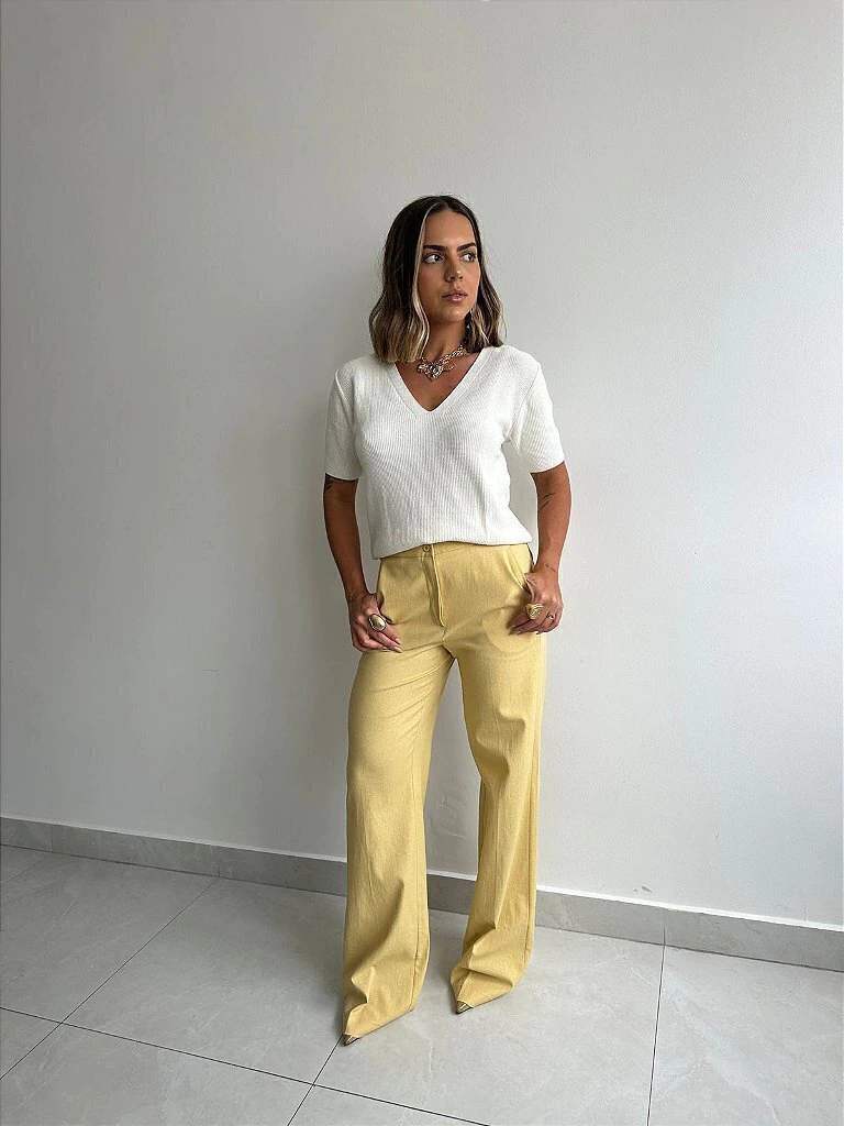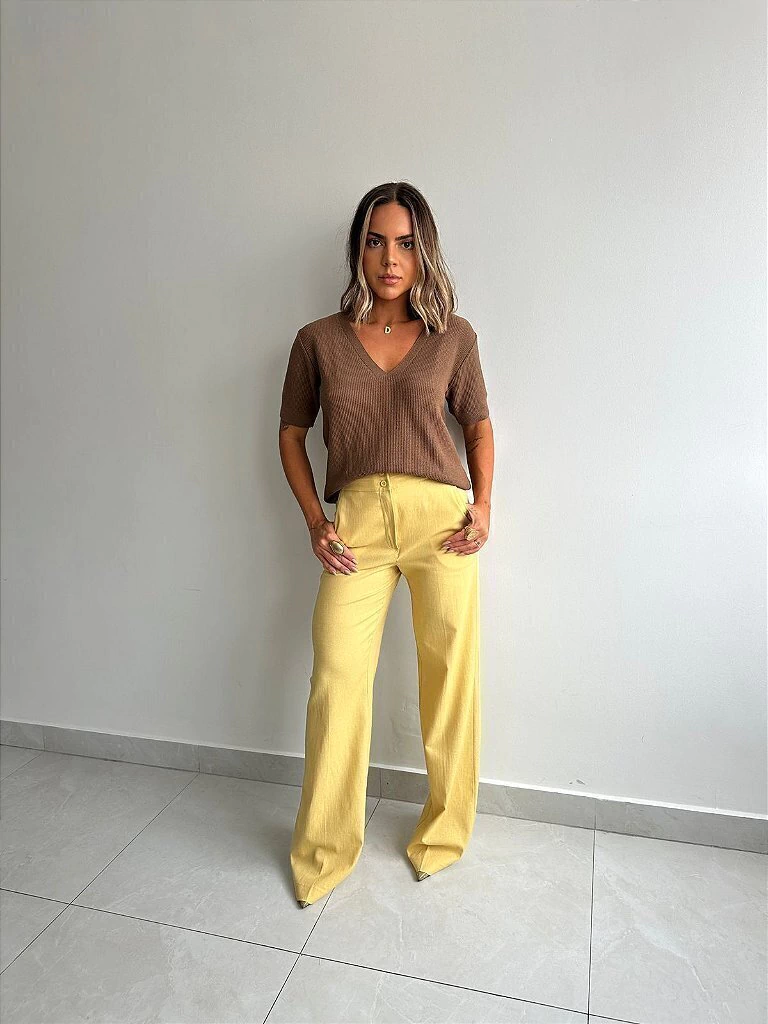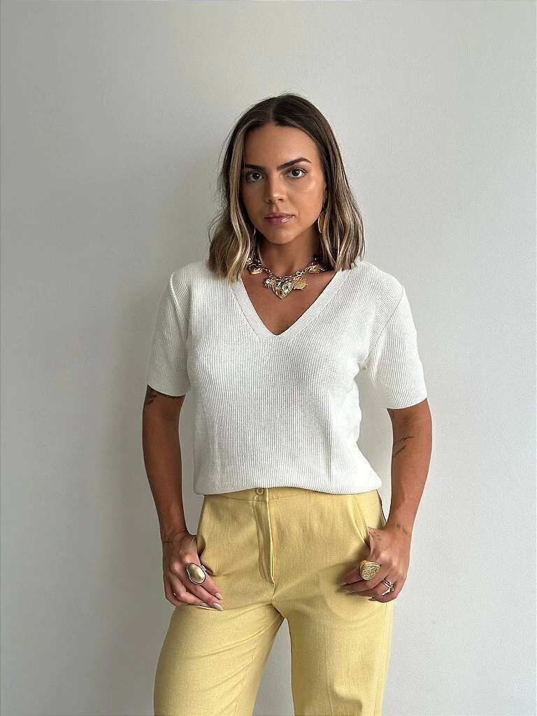 Blusa em trico com gola V e manga curta. Possui caimento solto ao corpo.