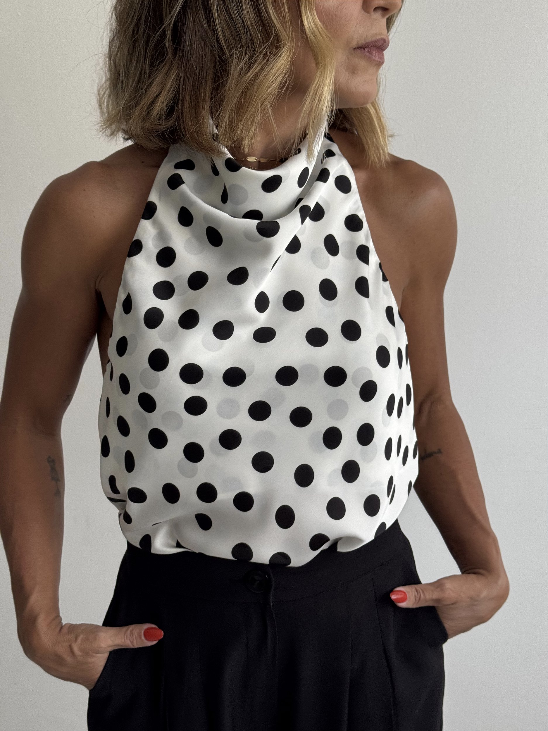 Blusa em tecido leve e fluido, estampada com clássico poá preto sobre fundo branco, trazendo um ar atemporal e sofisticado. O modelo possui decote frente única, com alças largas que se cruzam e se amarram na nuca, garantindo conforto e ajuste personalizado.